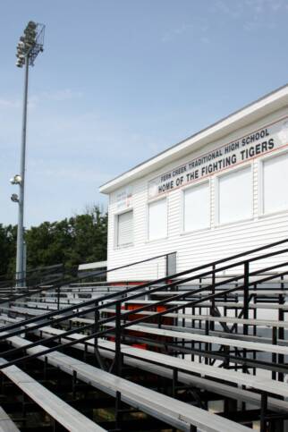The covered walkway used in all weather to gain dry access to the portables and to the locker rooms, for physical education and sports. Notice the bricked up windows on the right, the first two adjacent to the boy's locker room, further down to the girl's. In our time, they were jalousie windows with frosted wire glass, which were often open, allowing shower and locker room sounds to filter outside to those passing by.
