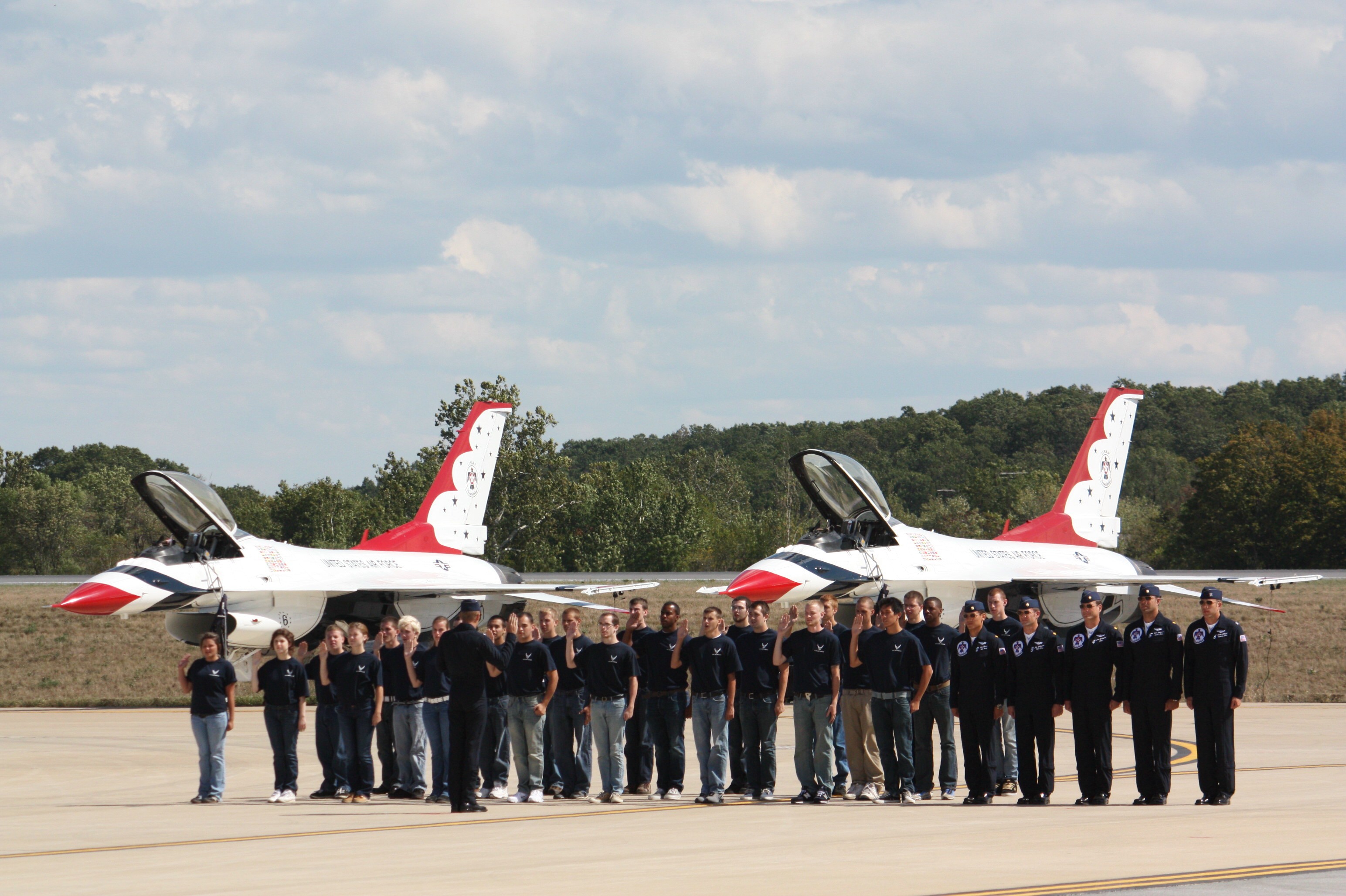 Before the Thunderbirds performed, their leader, Lt. Col. Case Cunningham administered the oath of allegiance to 23 new USAF recruits on the flight line at the 167th Airlift Wing.